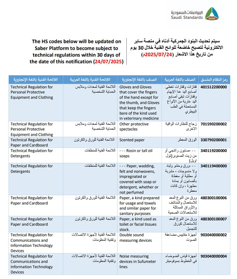2025 年 7 月,沙特阿拉伯标准组织 SASO(Saudi Standards, Metrology and Quality Organization)发布通知,宣布部分产品将在该通知发布日期(2025 年 7 月 24 日)的 30 天内被纳入管控清单。自生效之日起,相关产品须符合相应的技术法规要求。
