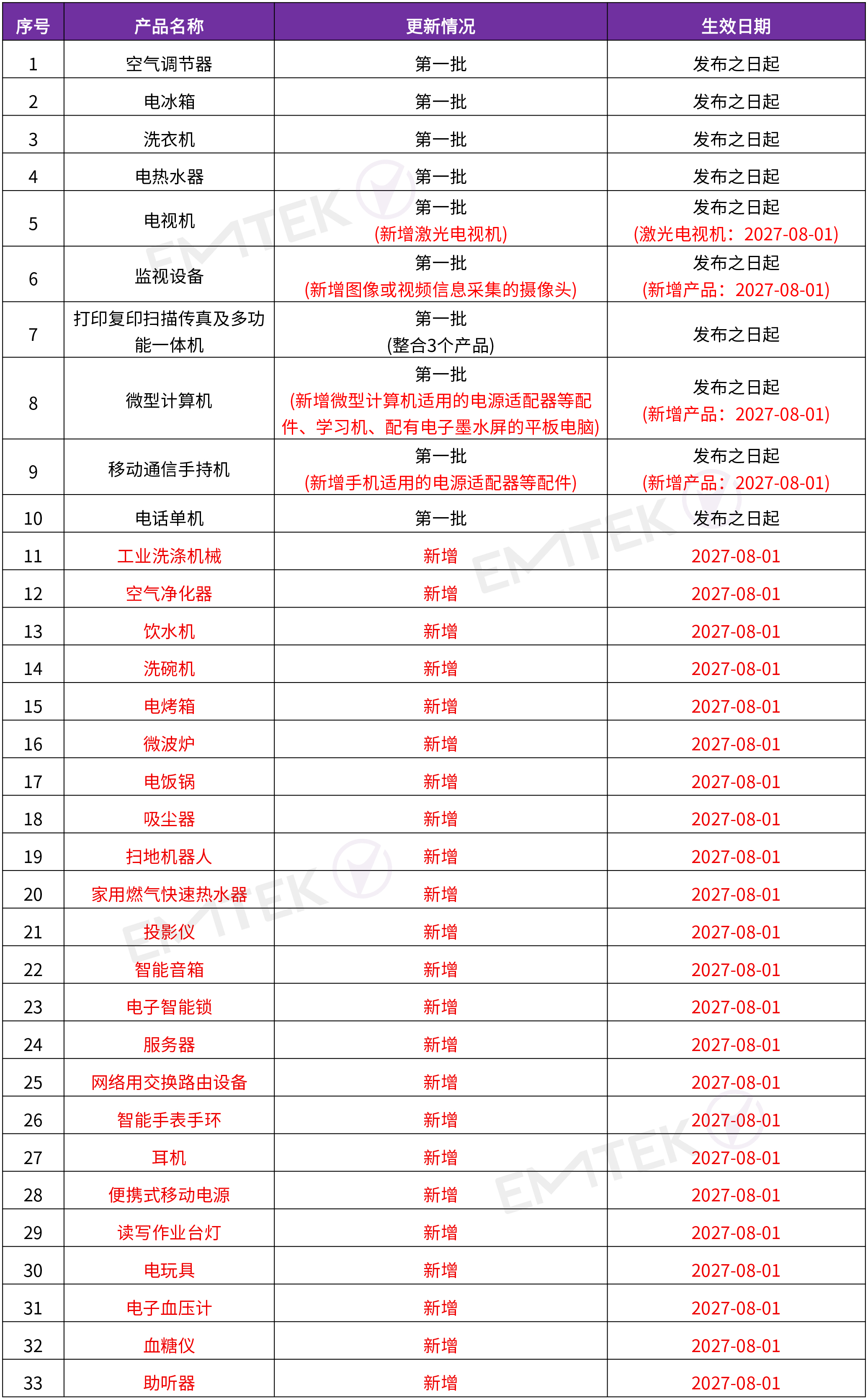 将第一批12 种产品优化整合为10 种(原有的打印机、复印机、传真机3 种产品根据技术发展情况合并为打印复印扫描传真及多功能一体机),新增23 种管控条件较为成熟的产品。调整后,《达标管理目录》内共计包含33 种产品,均为消费者日常生活中使用场景多、使用频次高的电器电子产品。